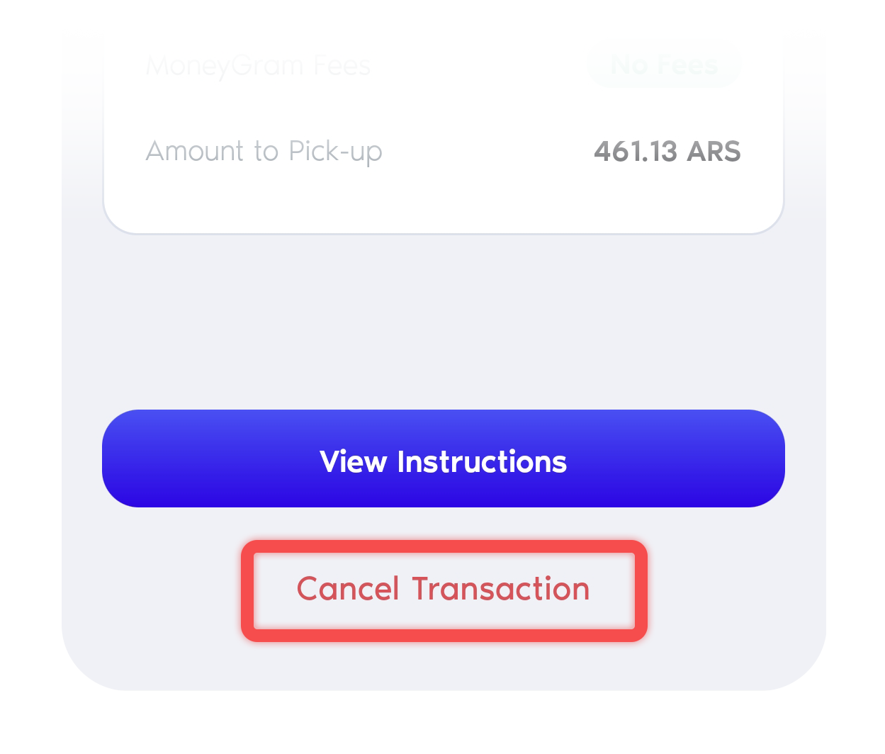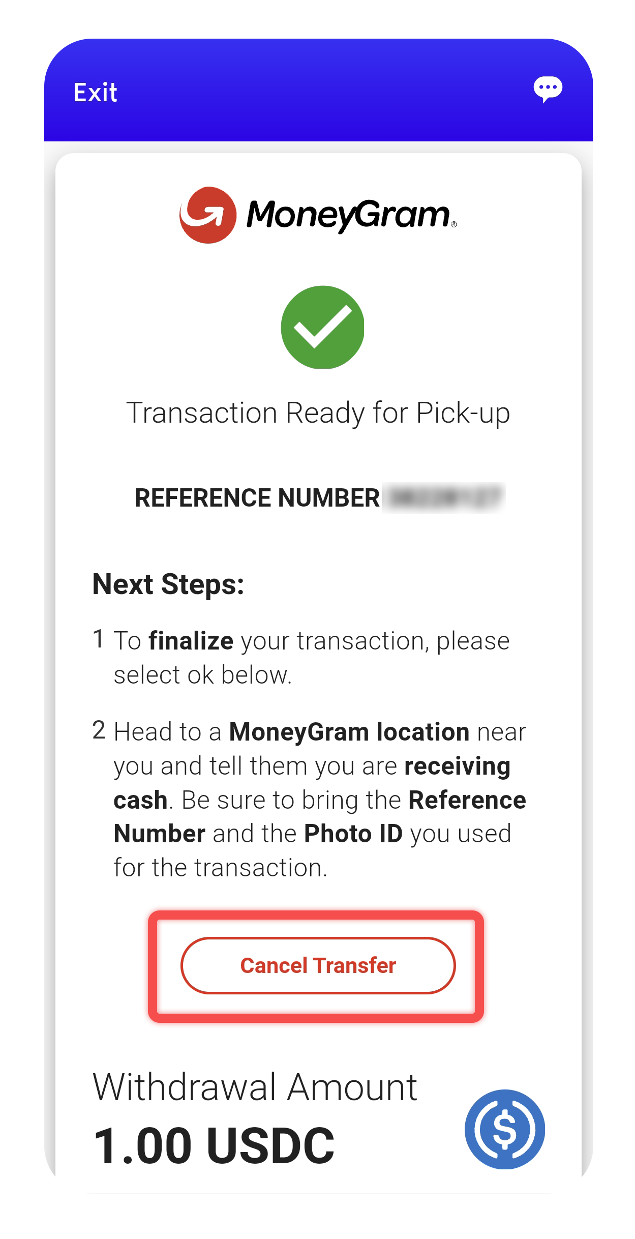 4. You’ll be redirected to the MoneyGram cash out details page, click on “Cancel Transfer”