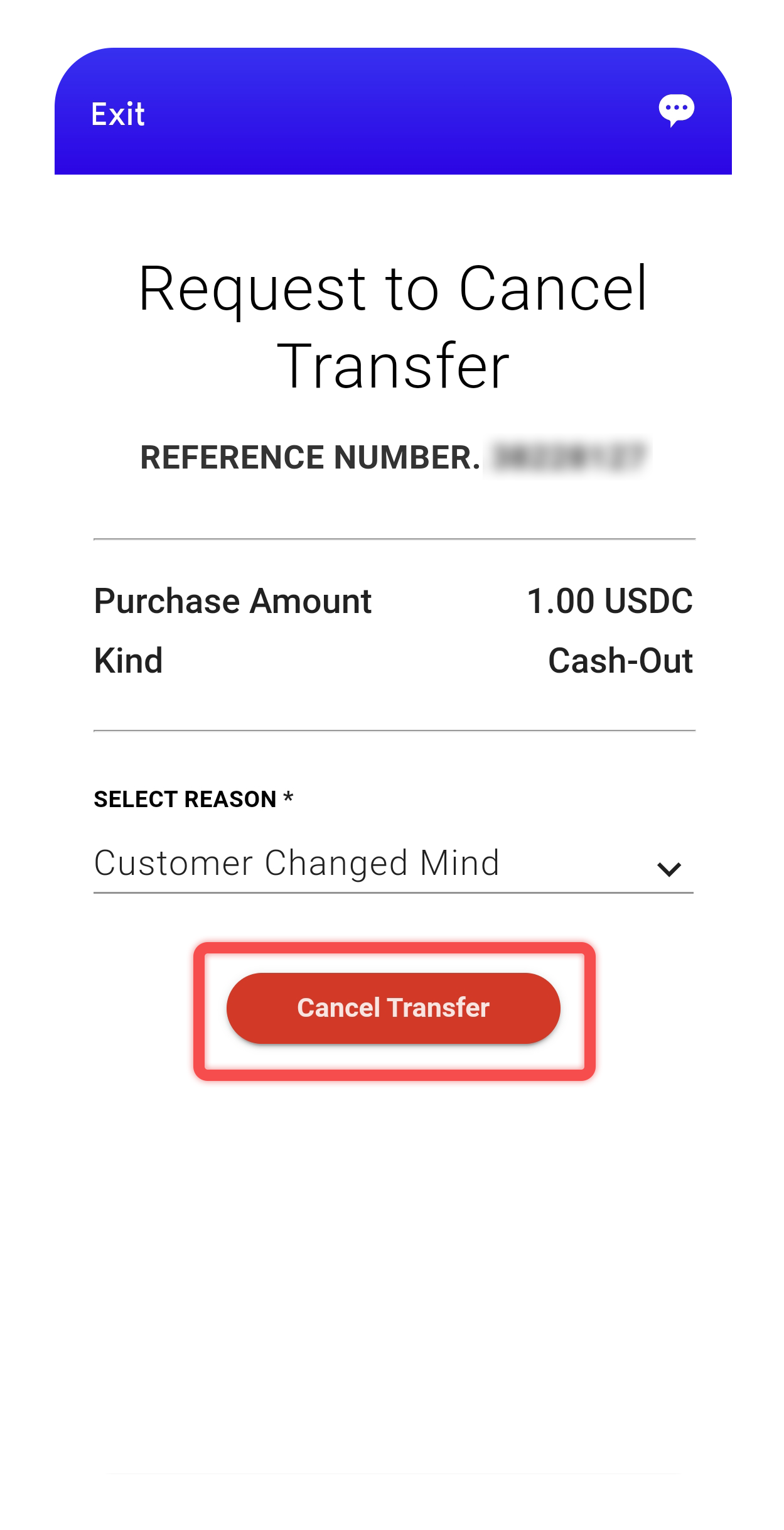 5. State the reason for refund and funds should be returned to your wallet and click on “Cancel Transfer”