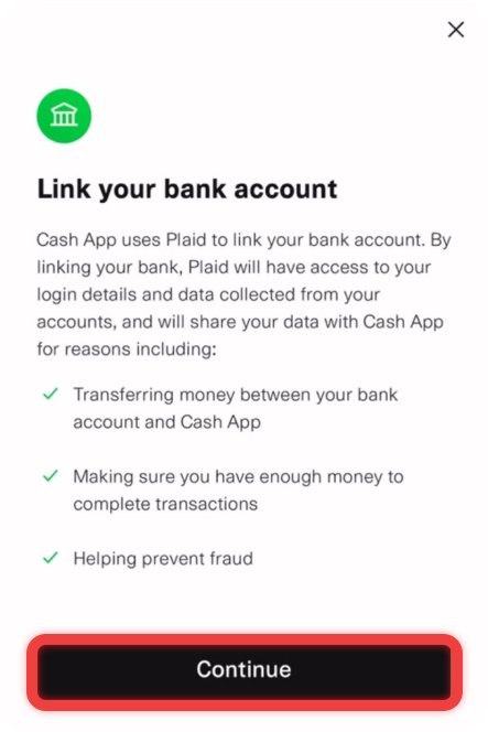 - CashApp te pedirá vincular tu cuenta bancaria. Toca "Continue".