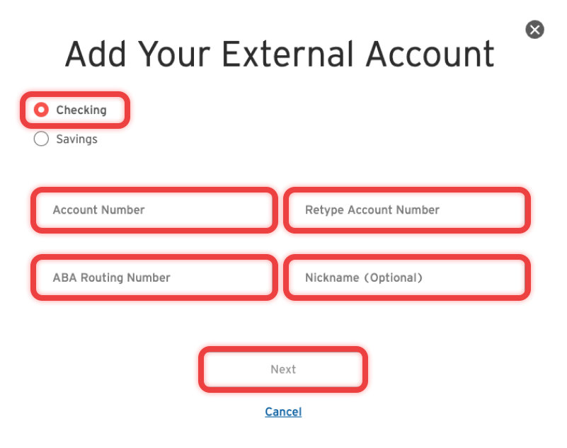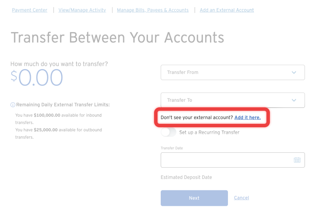 Vá até a aba "Payments & Transfers" e selecione "Your External Accounts".